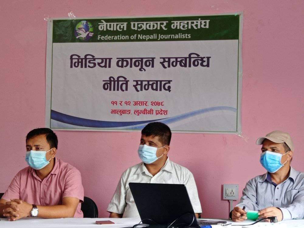 लुम्बिनी प्रदेश आन्तरिक मामिला तथा कानुन मन्त्रालयको सहयोगमा नेपाल पत्रकार महासंघ लुम्बिनी प्रदेश समितिको आयोजनामा शुक्रवार देखि लुम्बिनी प्रदेशको स्थायी राजधानी भालुवाङमा सुरु भएको कोभिड महामारी र पत्रकारिता विषयक अन्तरक्रिया कार्यक्रम अन्तरगत शनिवार दोस्रो तथा अन्तिम दिन कानुन सम्बन्धी नीतिगत संवाद कार्यक्रममा बोल्दै सो कुरा बताएको भएको हो ।