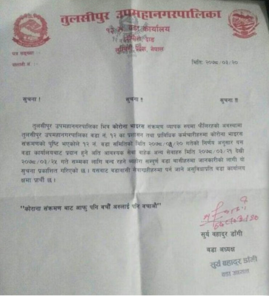 दाङ । तुलसीपुर उपमहानगरपालिका वडा नम्बर १२ को वडा कार्यालयका कर्मचारीमा कोरोना संक्रमण पुष्टि भएपछि पाँच दिनका लागि कार्यालय बन्द गरिएको छ । वडाको प्रशासन तथा प्राविधिक कर्मचारीहरुमा कोरोना पुष्टि भएको हो ।