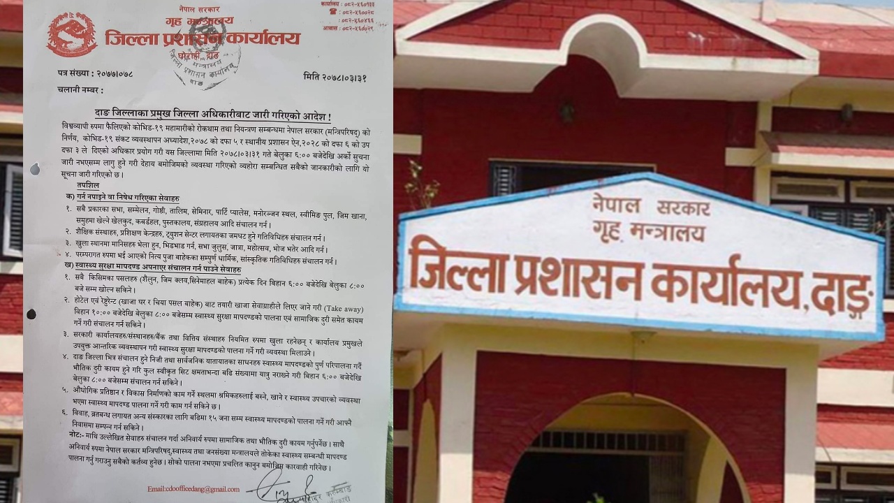दाङ । नेपाल सरकारको मन्त्रीपरिषदको अर्को सूचना जारी नहुँदासम्म दाङमा लकडाउन थप गरिएको छ । तर, थप खुकुलो बनाईएको छ । विहीबार बसेको जिल्ला कोरोना शंकट व्यबस्थापन केन्द्रको बैठकले विहान ६ बजेदेखि साँझ ८ बजेसम्म बजार खोल्ने निर्णय गरेको हो । खाजा घर र चिया पसल बाहेक होटेल एवं रेष्टुरेन्टबाट सेवाग्राहीले तयारी खाजा लिएर जान पाउने भएका छन् ।