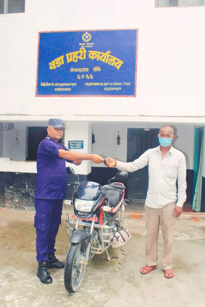 त्यस्तै उजुरी पछि वडा प्रहरी कार्यालय नेपालगन्जले खोजतलास गर्दा नापि कार्यालय नजिकै गएको २९ गते साँझ वेवारिसे अवस्थामा फेला पारेको वडा प्रहरी कार्यालयका नेपालगन्जका प्रहरी प्रमुख प्रहरी निरीक्षक डिल्ली बहादुर खड्काले जानकारी दिनु भयो । उक्त मोटरसाइकल सम्बन्धित धनि फन्दु थारुलाई बुझाईएको वडा प्रहरी प्रमुख खड्काले बताए ।