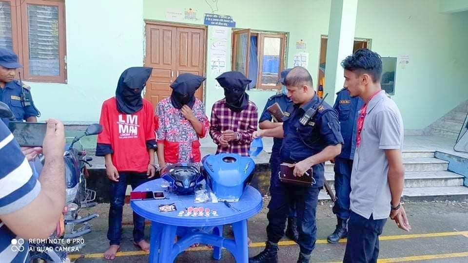 दिउँसोको समयमा ईलाका प्रहरि कार्यालय कोहलपुरबाट खटिएको प्रहरी टोलिले कोहलपुर नगरपालिका वडा नं ११ स्थित बसपार्कको पुर्व तर्फको सडकमा निम्न व्यक्तिहरुले चोरी गरी लिदै गरेको भे ३ प ६००४ नं को डिस्कभर कालो निलो रंगको मोटरसाईकल थान १. NS मोटरसाइकलको निलो रंगको हेड लाईट थान १,पल्सर मोटर साईकलको निलो रंगको ट्याङकी कभर थान १ र मोटर साईकलको पाट पुजाहरु खोल्न प्रयोग गरीने स्क्रु ड्राईभर थान १,रेन्ची १.मो.सा.स्टिकर थान ७,मोबाईल थान ३,नाईट्राभ्याट १३ चक्की सहित फेला पारी ,उक्त गिरोहलाई नियन्त्रणमा लिई अनुसन्धान भैरहेको ईलाका प्रहरी कार्यालय कोहलपुरका प्रहरी प्रमुख डिएसपि रबिन्द्र खनालले जानकारी दिनुभएको छ ।