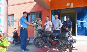 बाँके । जिल्ला बहराईज रुपैडिहा भारतबाट नम्बर नखुलेको बुलेट मोटरसाइकल भारतीय प्रहरी रुपैडिहाले आवश्यक खोजतलास लागि जानकारी आएकोमा ईलाका प्रहरी कार्यालय जमुनाहबाट खटिएको प्रहरी टोलीले सोमबार बाँके नेपाल गन्ज उपमहानगरपालिका १५ नयाँ बस्तीबाट बेवारीसे अवस्थामा फेला पारी सम्बन्धीत भारतिय प्रहरीलाई उक्त मोटरसाइकल जिम्मा लगाएको छ ।