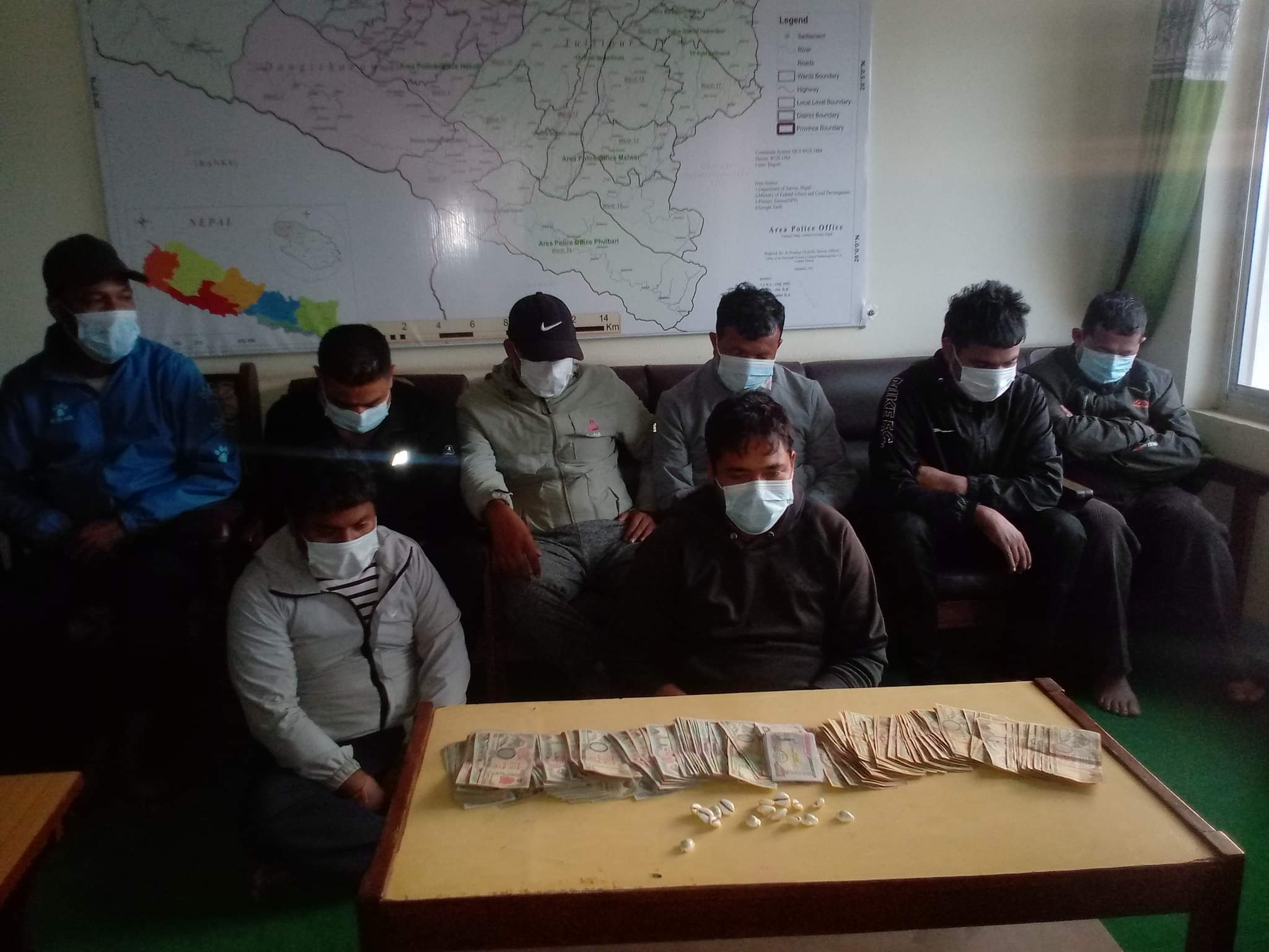 दाङ । दाङमा प्रहरीले आठ जना जुवाडेलाई प्रक्राउ गरेको छ । जिल्लाको तुलसीपुर उपमहानगरपालिका वडा नम्बर ६ रजौरा स्थित विष्णु आचार्यको खाली घरमा जुवा खेलिरहेको अवस्थामा उनिहरुलाई प्रक्राउ गरेको हो ।