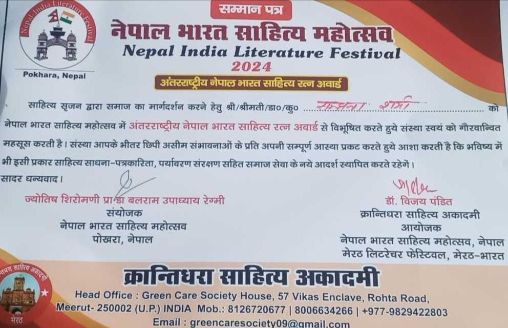 कास्की । गण्डकी प्रदेशको राजधानी पोखरामा सञ्चालित “नेपाल भारत साहित्य महोत्सव”(२०८०) मा “कादम्बिनी” संयुक्त चारु सङ्ग्रह लोकार्पण गरिएको छ। नेपालको पूर्वदेखि पश्चिम सम्मका जम्मा ५७ जना चारुकार हरुको संयुक्त लेखन तथा नेपाली साहित्यकार विश्व सञ्जालको प्रकाशनमा यो कृति प्रकाशित भएको हो । पश्चिम डढेलधुरा, रुकुम पूर्व,रूकुम पश्चिम, कैलाली, बाँके, दाङ, गुल्मी, अर्घाखाँची, बागलुङ, पोखरा,लमजुङ, कपिलवस्तु, […]