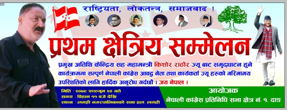 दाङ । नेपाली काँग्रेस क्षेत्र नम्बर १ देउखुरीको प्रथम क्षेत्रिय सम्मेलन फागुन २० गते सनिबार लमहीमा हुने भएको छ । सम्मेलनको समुद्घाटन नेपाली काँग्रेसका केन्द्रीय सह महामन्त्री किशोर राँठौरले गर्ने कार्यक्रम रहेको क्षेत्रिय सभापती भेषराज पाण्डेयले बताए । अधिबेसन पश्चात् पहिलो चोटि हुन सम्मेलन हुन थालेको हो । समितीले अहिले सम्म गरेका कामहरु र भाबी […]