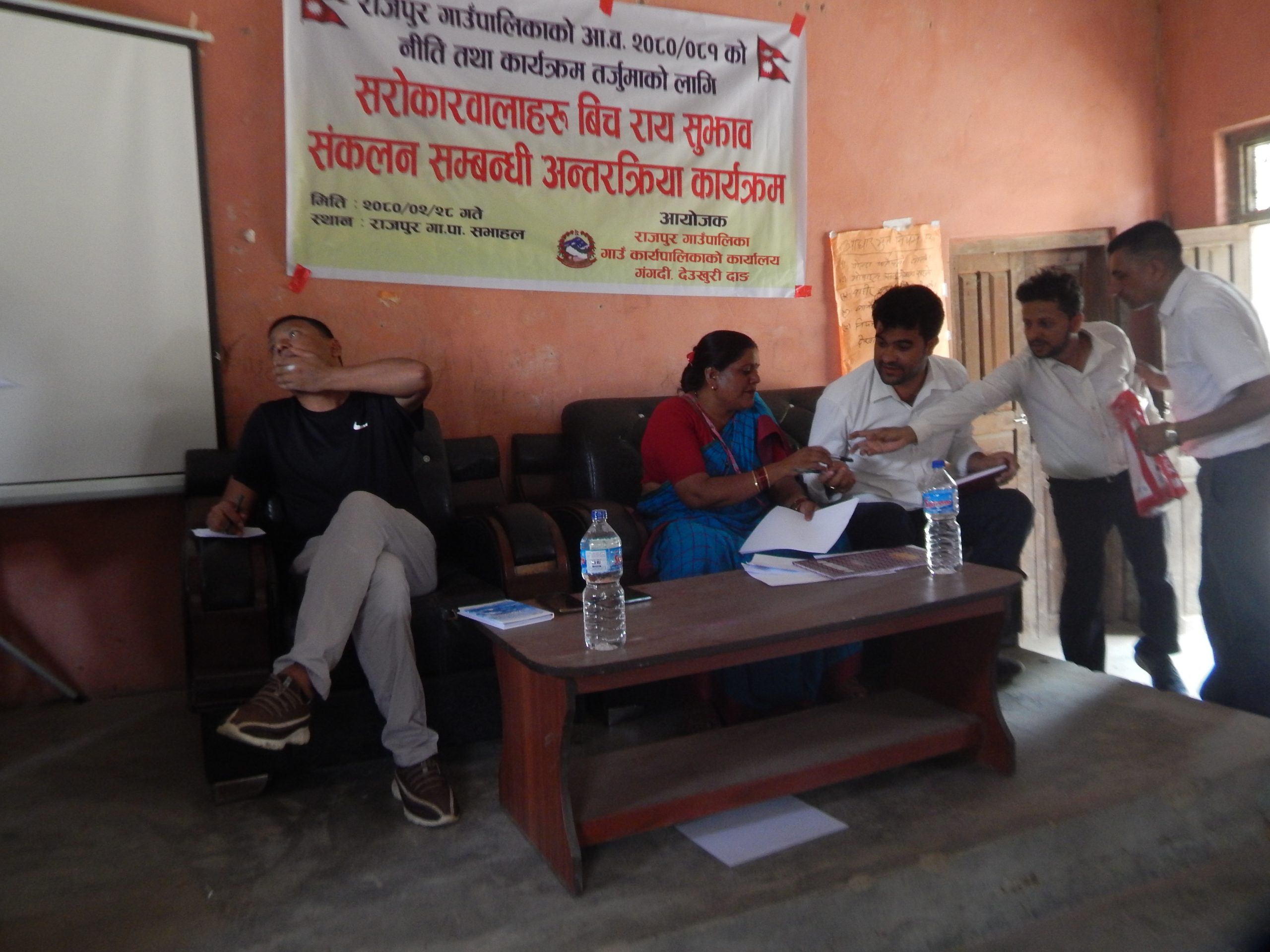 दाङ । देउखुरीको राजपुर गाउँपालिकाले आर्थिक वर्ष २०८०/०८१ को नीति तथा कार्यक्रम तर्जुमाका लागि सरोकारवालाहरुको बीच राय सुझाव संकलन सम्बन्धि अन्तरक्रिया कार्यक्रम सम्पन्न गरेको छ । आइतबार राजपुर गाउँपालिका अध्यक्ष शरद कुमार बुढाथोकीको अध्यक्षतामा सम्पन्न भएको अन्तरक्रिया कार्यक्रममा वडा सदस्य,टोल विकास, राजनीति दल,विभिन्न संघ-संस्थाका प्रतिनिधिहरुले स्वास्थ्य, शिक्षा, कृषि,खानेपानी, विद्युत,यातायात, वन वातावरण, सुशासन लगायतको विषय बस्तुमा […]