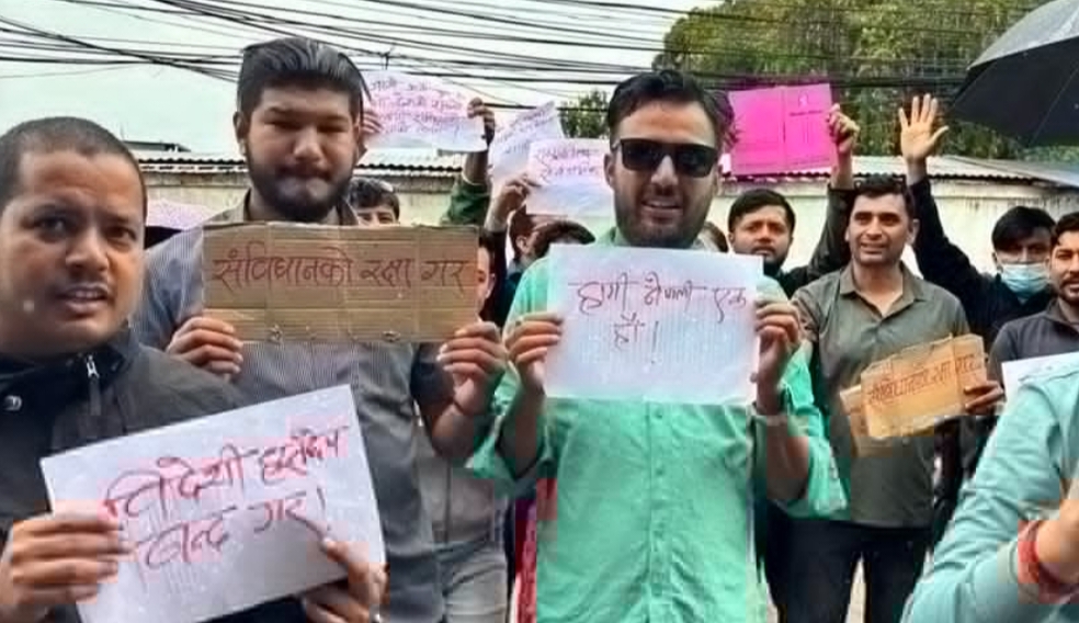 काठमाडौँ । नेपाली कांग्रेसको भ्रातृ संगठन नेपाल विद्यार्थी संघले संविधानको रक्षा गर्न माग गर्दै आज मीनभवनमा प्रदर्शन गरेको छ । नेपाल विद्यार्थी संघका पूर्वकोषाध्यक्ष शिव रिमालको संयोजनमा नेपाल विद्यार्थी संघ नेपाल कमर्स क्याम्पस इकाईले संविधानको रक्षा गर्न माग गर्दै प्रदर्शन गरेको हो । त्यस्तै प्रदर्शनमा विद्यार्थीहरुले विदेशी हस्तक्षेप बन्द गर लेखेका प्लेकार्ड समेत बोकेका छन् […]