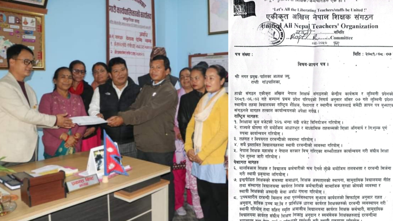 दाङ । एकीकृत अखिल नेपाल शिक्षक संगठनले दाङ जिल्ला सहित लुम्बिनी प्रदेशका १२ वटै जिल्लाका सबै स्थानीय तहमा एकैसाथ ज्ञापनपत्र बुझाएको छ। संगठनकाे केन्द्रीय कार्यक्रम र लुम्बिनी प्रदेश परिषदको निर्णयअनुसार शिक्षक र कर्मचारीका विभिन्न शैक्षिक तथा पेशागत माग गर्दै ज्ञापनपत्र बुझाएको हाे। यसै क्रममा दाङको राप्ती गाउँपालिका कमिटीले शुक्रबार गाउँपालिकामा ज्ञापनपत्र बुझाएको छ ।संगठनका अध्यक्ष […]