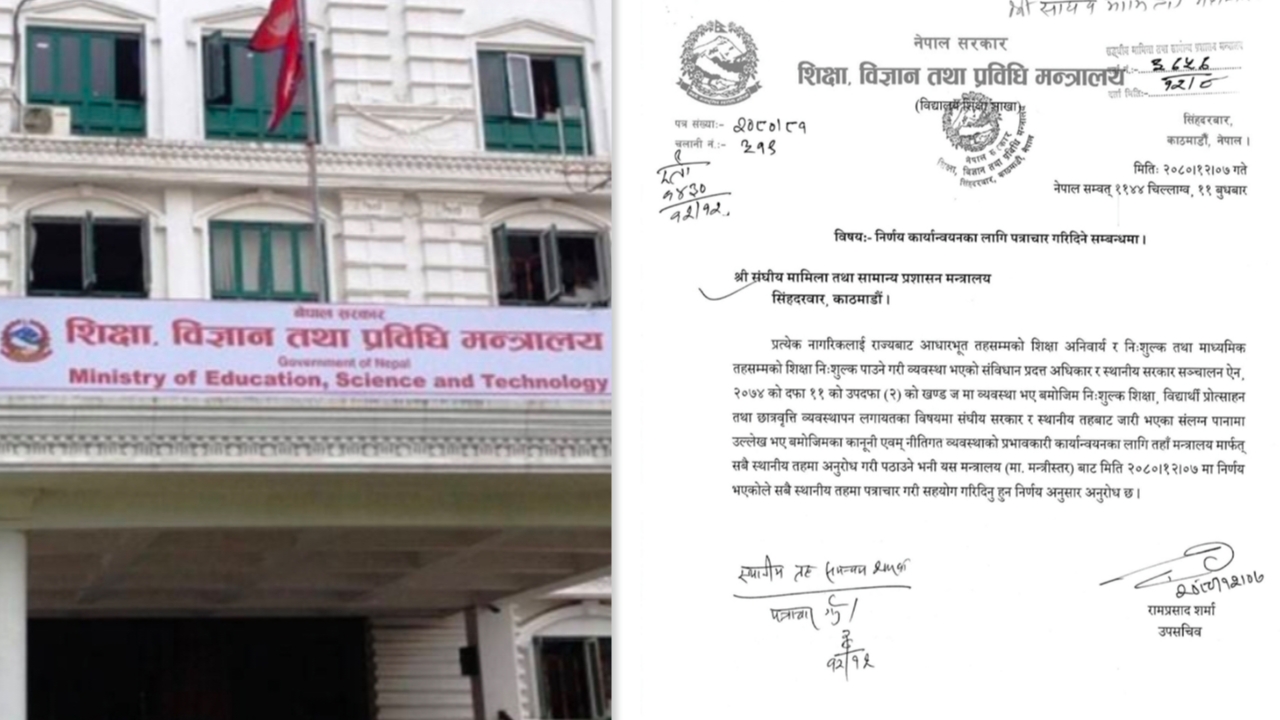 काठमाडौं । शिक्षा विज्ञान तथा प्रविधि मन्त्रालयले सार्वजनिक विद्यालयमा निःशुल्क शिक्षा र निजी लगानीका (संस्थागत) विद्यालयमा शुल्क निर्धारण एवम् छात्रवृत्तिका सम्बन्धमा विभिन्न व्यवस्थाहरु सुनिश्चित गर्न विभिन्न निर्देशनहरु दिएको छ । मन्त्रालयले विशेषगरी निजी तथा संस्थागत विद्यालयले निःशुल्क शिक्षाका सम्बन्धमा लागु गर्नपर्ने कानुनी व्यवस्थाहरु कार्यान्वयमा कडाइ गर्न स्थानीय तहलाई निर्देशित गरेको हो ।विभिन्न नाममा जथाभावी शुल्क […]