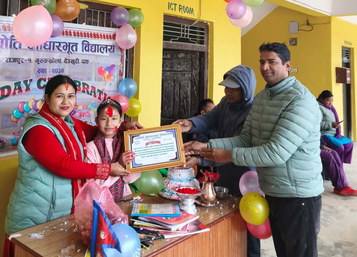 दाङ । बालबालिकाको शिक्षामा सानो सहयोगले ठूलो सपना निर्माण गर्न सकिन्छ भन्ने उदाहरण राजपुर गाउँपालिका–१,गुरुङखोला स्थित ज्योति आधारभूत विद्यालयमा देखिएको छ। उक्त विद्यालयमा अध्ययनरत विद्यार्थीहरुलाई ५३ हजार २ सय ५० बराबरको स्टेसनरी सामग्री हस्तान्तरण गरि एक परिवारले सामाजिक उत्तरदायित्वको उत्कृष्ट उदाहरण प्रस्तुत गरेको छ । बुवा टीका मल्ल र आमा नूतन सिं ठकुरीको आर्थिक सहयोगमा […]