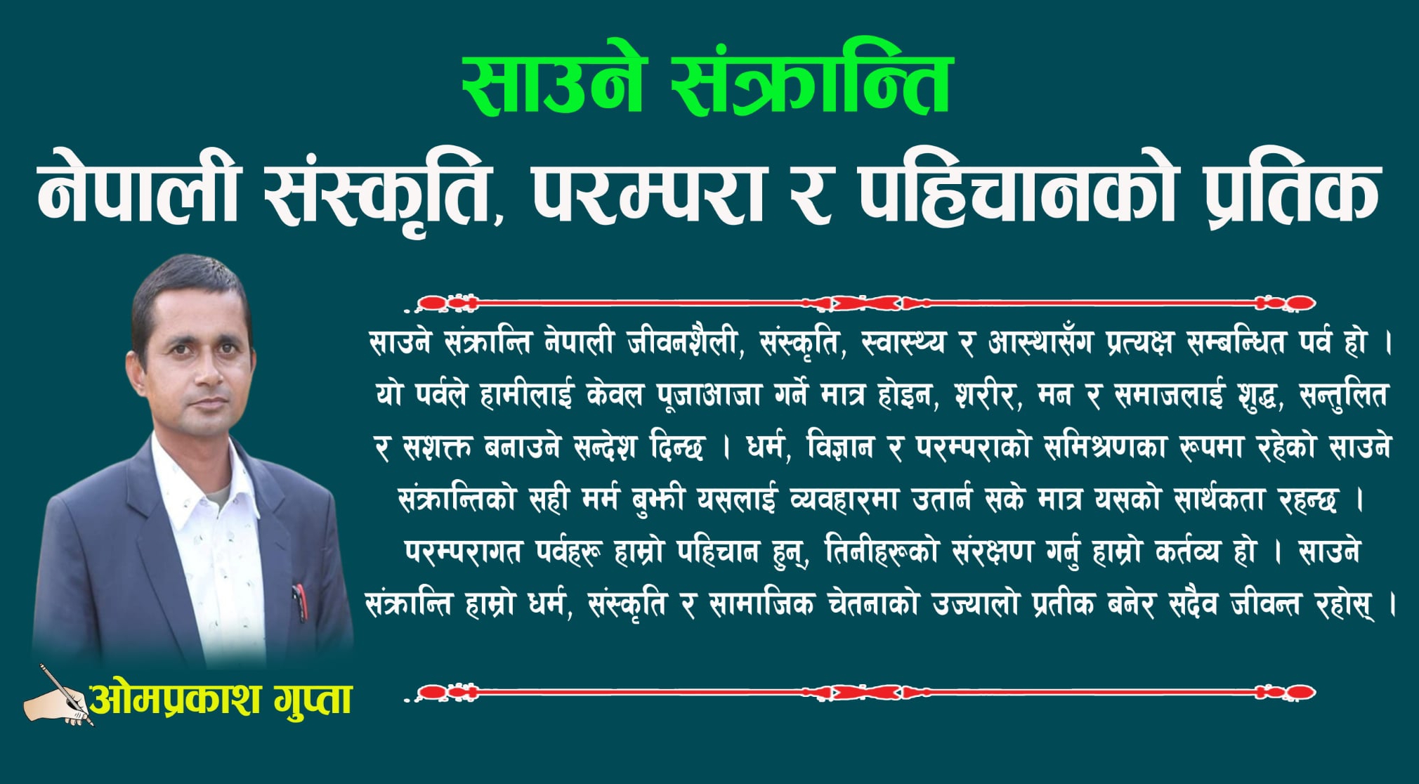 नेपाल विभिन्न जातजाति,भाषा,धर्म र संस्कृतिको साँझा फूलबारी हो । प्रत्येक चार्डपर्व, रीतिथिति जनजीवनसँग जोडिएका छन् । ती पर्वहरु मध्ये साउने संक्रान्ति पनि एक महत्वपूर्ण सांस्कृतिक तथा धार्मिक चाड हो,जसले विशेष गरी हिन्दू धर्मावलम्बीहरुको जीवनशैली,आस्था र सामाजिक सम्बन्धलाई उजागर गर्छ । साउन महिनाको पहिलो दिन परेको यो पर्व केवल एक दिनको उत्सव होइन, यसले एक महिना […]
