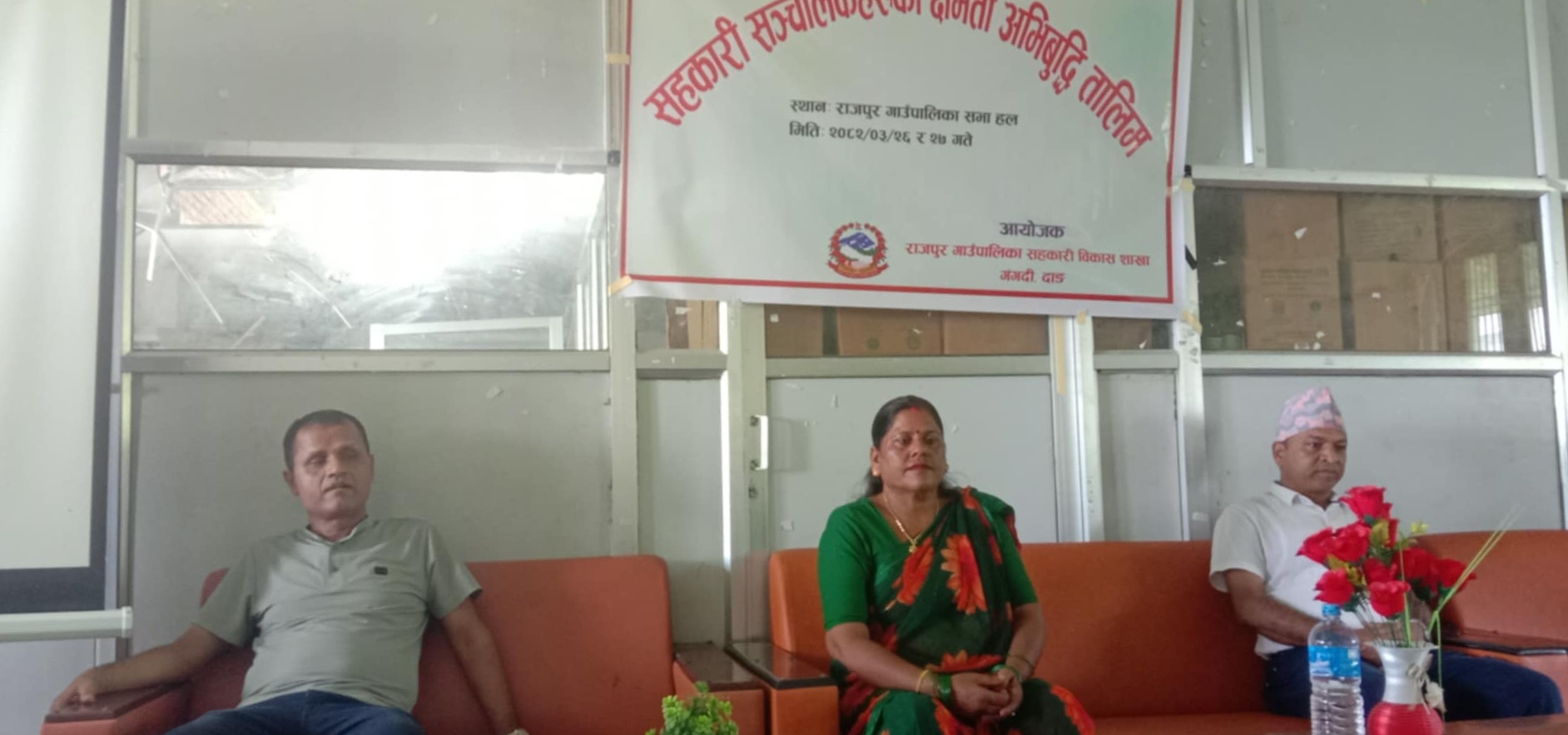 दाङ । पछिल्लो चरणमा सहकारीहरुमा देखिएको बिकृति विसंगतिलाई अन्त्य गर्न सहकारी ऐन र नियमावली बमोजिम सहकारीहरु सञ्चालन गर्नुपर्ने देउखुरीको राजपुरमा आयोजित एक कार्यक्रममा राजपुर गाउँपालिकाकी उपाध्यक्ष धनपती देवी यादवले बताएकि छिन् ।जसले सहकारी ऐन नियम र सिद्धान्तहरुलाई मिचेर जान्छ त्यो सहकारी डुब्यो भनेर जाने हुन्छ । कतिपय सहकारीहरु कर्मचारीको विश्वाँस गर्दा डुबेका छन् भने कतिपय […]