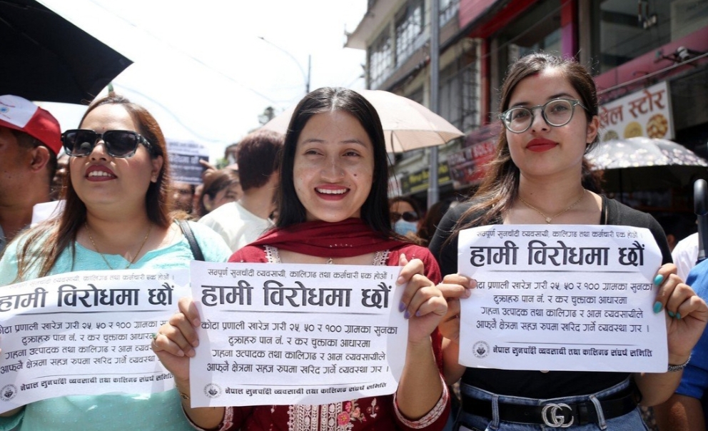 काठमाडौँ । सुनचाँदी व्यवसायीहरु फेरि आन्दोलित बनेका छन् । आगामी आर्थिक वर्ष २०८२/८३ को आर्थिक विधेयकमार्फत सरकारले सुनमा लगाएको २ प्रतिशत विलासिता कर र हिरामा लगाएको १३ प्रतिशत मूल्य अभिवृद्धि करको विरुद्धमा सुनचाँदी व्यवसायी आन्दोलित बनेका हुन् । त्यस्तै यसअघि प्रधानमन्त्री केपी शर्मा ओलीले आफूहरुको माग पूरा गर्ने प्रतिबद्धता जनाएपछि विनियोजन विधेयक पास हुँदा आफूहरूको […]