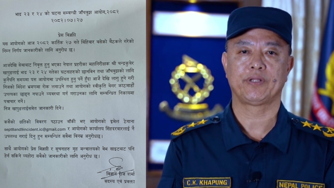 काठमाडौं । आजदेखि सेवा निवृत्त भएका नेपाल प्रहरीका आइजिपी चन्द्रकुवेर खापुङलाई विदेश जान रोक लगाइएको छ। भदौ २३ र २४ गतेको घटनासम्बन्धी जाँचबुझ आयोगको आजको बैठकले खापुङलाई विदेश जान रोक लगाउने निर्णय गरेको हो । साथै आयोगको अनुमतिबिना खापुङ काठमाडौं उपत्यका छाडेर बाहिर जान पनि पाउने छैनन् । त्यस्तै सरकारले जेनजी पुस्ताको आन्दोलनका घटनाबारे पूर्वन्यायाधीश […]