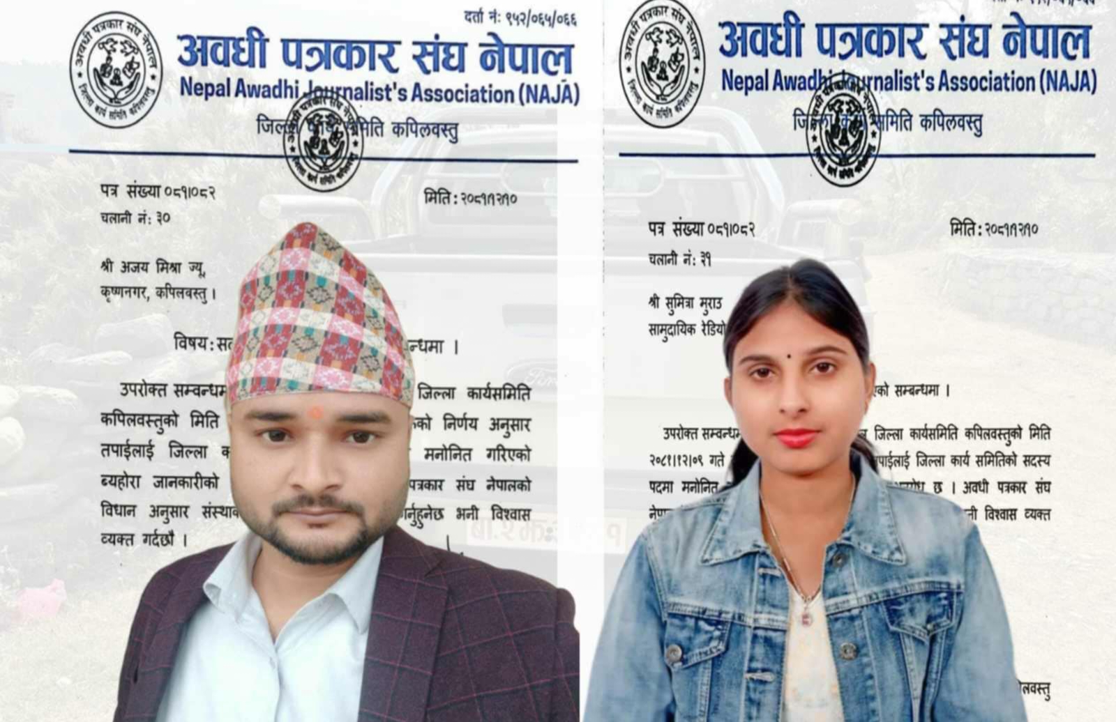 कपिलवस्तु । अवधी पत्रकार संघ नेपाल कपिलवस्तु शाखाको सदस्यता मनेनित गरीएको छ । अवधी पत्रकार संघ नेपाल कपिलवस्तुको शनिवार बसेको बैठकको निर्णयले जिल्ला र्काय समितिको सदस्यमा अजय मिश्र र सुमित्रा मुराउलाई मनोनित गरेको संघका अध्यक्ष मनिष कुमार गुप्ताले जानकारी दिए । त्यस्तै मिश्र र मुराउलाई संघभित्र सक्रिय भूमिका निर्वाह गर्ने अवसर प्रदान गरिएको र मनोनीत सदस्यहरूले […]