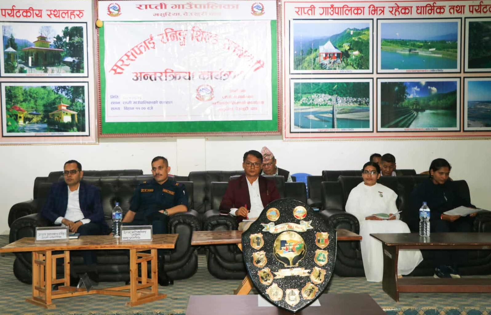 दाङ । देउखुरीको राप्ती गाउँपालिकामा सरसफाइ रनिङ्ग शिल्ड कार्यक्रमलाई थप प्रभावकारी र व्यवस्थित बनाउन सम्बन्धित सरोकारवालाबीच अन्तरक्रिया कार्यक्रम आइतबार सम्पन्न भएको छ। गाउँपालिकाका अध्यक्ष प्रकाश विष्टको अध्यक्षतामा सम्पन्न कार्यक्रममा वक्ताहरुले फोहोर व्यवस्थापनलाई दीगो बनाउन फोहोरलाई स्रोतमै वर्गीकरण गर्नुपर्नेमा जोड दिएका थिए । साे अवसरमा बोल्दै गाउँपालिकाका अध्यक्ष विष्टले सफा,स्वस्थ र सुन्दर गाउँपालिका निर्माण सबैको साझा […]