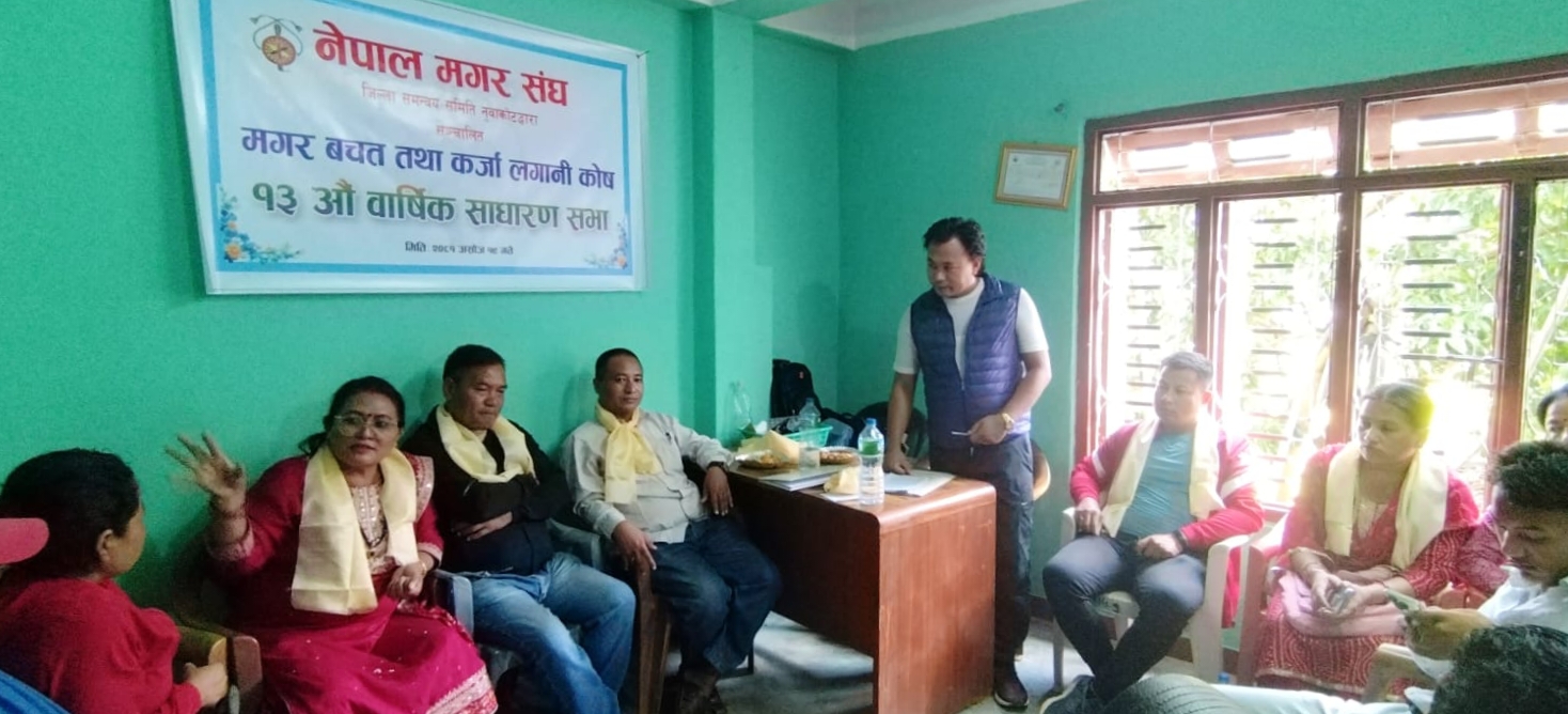 नुवाकोट । बिदुर नगरपालिका वडा नम्बर ४ मा रहेको मगर बचत तथा कर्जा लगानी कोषको १३ औं वार्षिक साधारण सभा शनिबार आफ्नै कार्यलय भवनमा सम्पन्न भएको छ । नेपाल मगर संघ केन्द्रीय सदस्य तथा नुवाकोट जिल्ला ईन्चार्ज/NEFIN नुवाकोट जिल्ला अध्यक्ष भगवान राना मगरकाे प्रमुख अतिथ्यता तथा नेपाल मगर संघ जिल्ला अध्यक्ष बचुमाया सुनारि मगरकाे विशेष आतिथ्यता,पुर्व जिल्ला उपाध्यक्ष […]