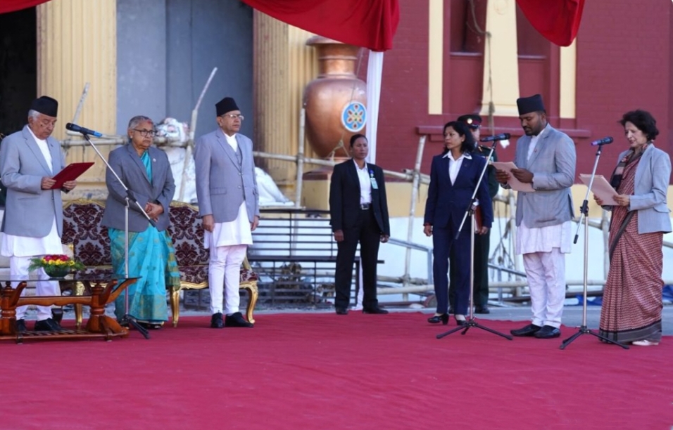 काठमाडौं । नव नियुक्त दुई मन्त्रीले शपथ लिएका छन् । राष्ट्रपति कार्यालय शिलतनिवासमा आयोजित विशेष समारोहमा नवनियुक्त मन्त्रीहरूको शपथ लिएका हुन् । प्रधानमन्त्री सुशीला कार्कीको सिफारिसमा राष्ट्रपति रामचन्द्र पौडेलले डा.सुधा शर्मा र बब्लु गुप्तालाई मन्त्री नियुक्त गरेका हुन् । यस्तै,शर्मा स्वास्थ्य तथा जनसंख्या मन्त्री नियुक्त भएकी छिन् भने गुप्ता युवा तथा खेलकुद मन्त्री नियुक्त भएका […]