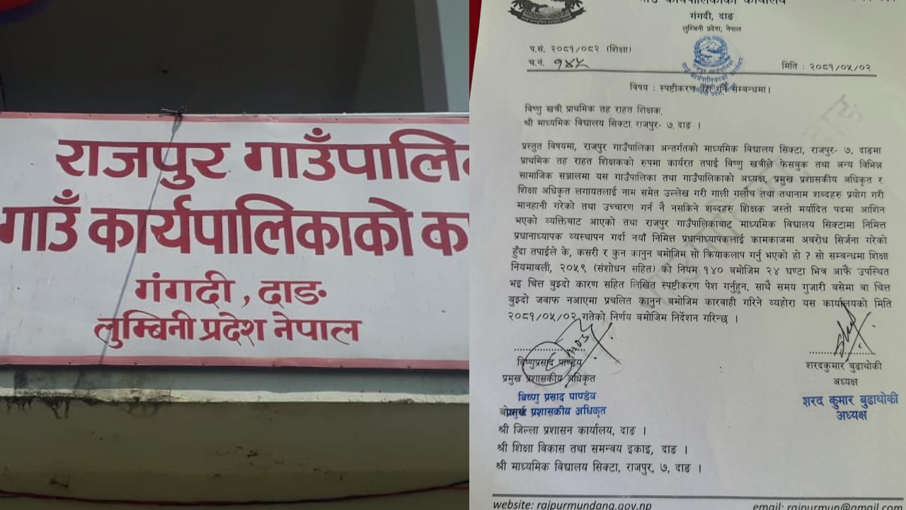 दाङ । देउखुरीको राजपुर गाउँपालिका वडा ७ मावि सिक्टाका पदच्युत भएका प्रधानअध्यापक विष्णु खत्रिलाई राजपुर गाउँपालिकाले २४ घण्टे स्ष्टिकरण सोधेको छ । पदच्युत प्रअ खत्रिले आफ्नो सामाजिक सञ्जाल फेसवुकमा पालिका अध्यक्ष , प्रमुख प्रशासकिय अधिकृत,शिक्षा शाखा प्रमुख लगायत लाई कर्मचारिलाई तथानाम गालिगलाेज गर्ने,पदभार गर्दा निमित प्रअलाई कुर्चि वाट लतार्ने लगायतका घटनामा खत्रिकाे संलग्नता देखिएकाे विषयमा […]