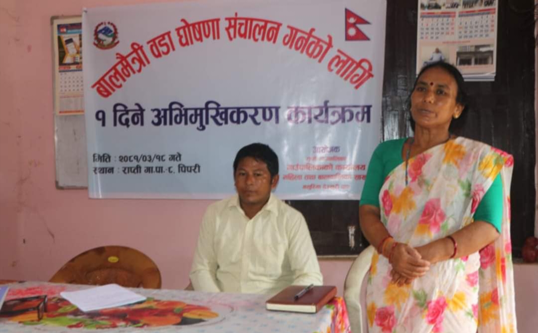 दाङ । देउखुरीको राप्ती गाउँपालिका वडा नम्बर ८ लाई बालमैत्री वडा घोषणा गर्ने तयारी थालिएको छ। बालमैत्री वडा घोषणाकाे लागि आवश्यक ५१ सुचकहरु मध्ये अधिकांश सूचकहरु पूरा गरि बालमैत्री वडा घोषणा गर्न लागिएको राप्ती गाउँपालिका महिला तथा बालबालिका शाखा प्रमुख जीवन कुमारी जिसीले जानकारी दिए । यसै क्रममा मंगलबार बालमैत्री वडा घोषणा संचालन सम्बन्धी पिपरीमा […]