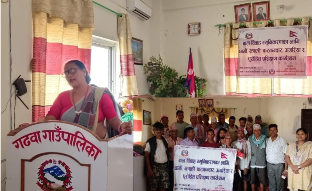 दाङ । बाल विवाह न्युनिकरण गर्न सबैको प्रयास आवश्यक रहेको गढवा गाउँपालिका उपाध्यक्ष शारदा कुमारी चौधरीले बताएका छन् । महिला,बालबालिका तथा जेष्ठ नागरिक शाखाले आयोजना गरेको बालविवाह न्युनिकरणका लागि धामी, झाँक्री, कटकन्दार,अगहरिया र पुरोहितका लागि प्रशिक्षण कार्यक्रममा बोल्दै उपाध्यक्ष चौधरीले सो कुरा बताएका हुन् । बालविवाह न्युनिकरणका लागि वडागत रुपमा सचेतनामूलक कार्यक्रम गर्न आवश्यक रहेको […]