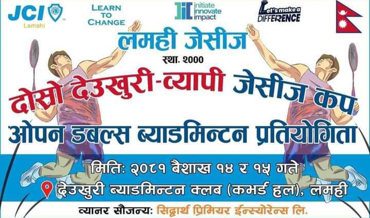 दाङ । लमही जेसीजकाे आयोजनामा दोस्रो देउखुरी व्यापी जेसीज कप अन्तर्गत ओपन डबल ब्याडमिन्टन प्रतियोगिता वैशाख १४ र १५ गते हुने भएको छ । “खेलको माध्यमबाट समाजमा रहेका यूवालाई जागरुक बनाई समाजमा क्रियाशील राखी समाज निर्माण, समाजको समृद्धि र विकासमा सहयोग हुने उद्देश्यले संञ्चालन हुन गइरहेको लमही जेसीजका अध्यक्ष मुकेश चौधारीले जानकारी दिइएका छन्। त्यस्तै […]