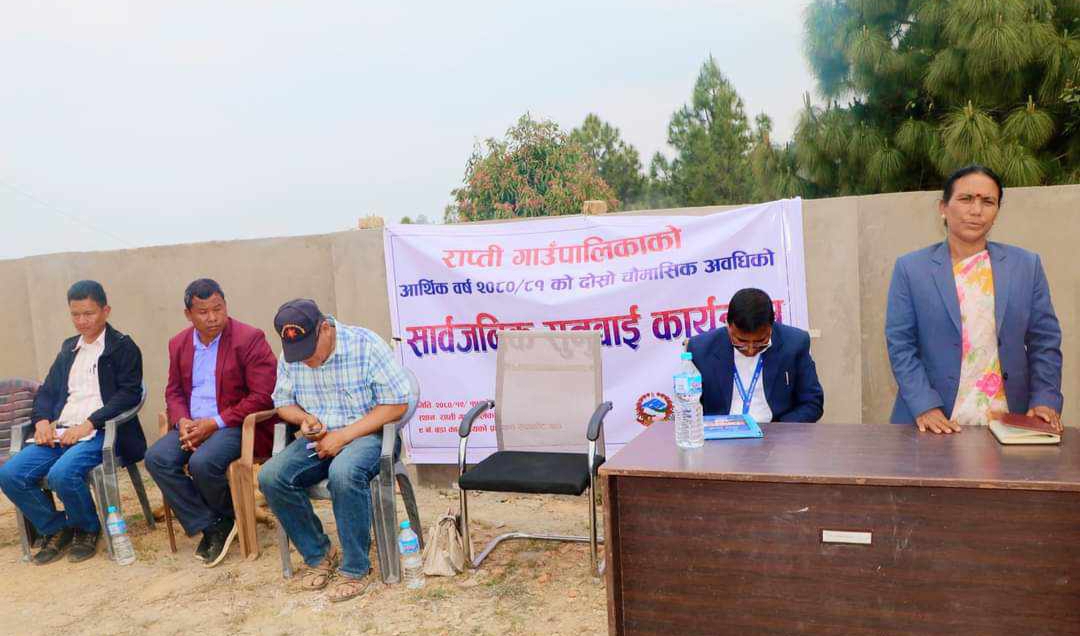 दाङ । राप्ती गाउँपालिकाले आर्थिक वर्ष २०८०/०८१ काे दाेस्राे चाैमासिक अवधिक सार्वजनिक सुनुवाइ कार्यक्रम बिहिवार सम्पन्न गरेको छ । गाउँपालिकाकाे वडा नं.९ रुपाकाेटमा कार्यक्रम आयोजना गरिएको थियो । राप्ती गाउँपालिका र मातहतका कार्यालयहरूको काम कार्वाही,सेवा प्रवाह,योजना जस्ता सार्वजनिक विषयमा सम्बन्धित सेवा प्रदायक र सेवाग्राहीबिच अन्तरक्रिया गराउने तथा सेवाप्रति सेवा प्रदायकलाई जबाफदेही बनाउने उद्देश्यले सार्वजनिक सुनुवाइ […]