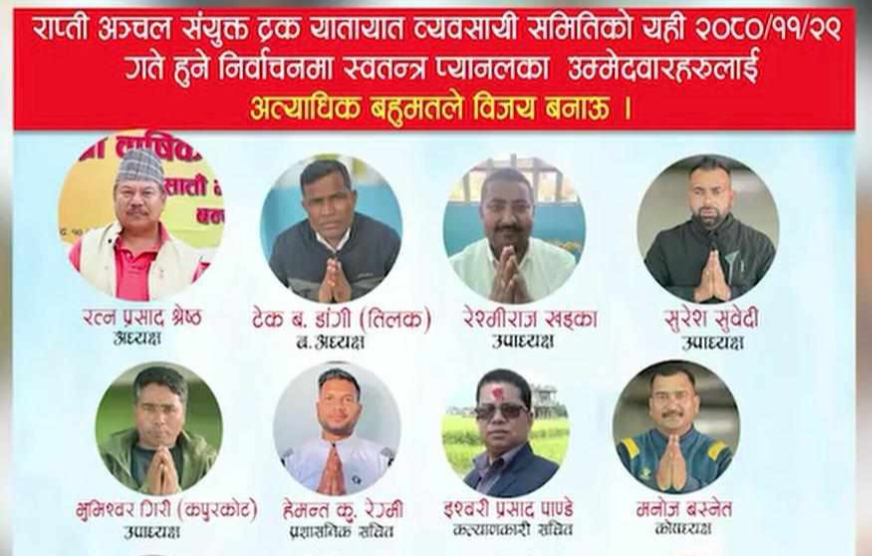 दाङ । राप्ती अञ्चल संयुक्त ट्रक यातयात व्यवसायी संघको २१ औँ साधारण सभा तथा १४ औँ अधिबेसन दाङको घोराहीमा शुरु हुँदैछ । फागुन २८ गते मनोनयन दर्ता र २९ गते निर्बाचनको कार्यतालिका छ । निर्बाचनमा लोकतान्त्रिक प्यानल र स्वतन्त्र प्यानल गरि २ प्यानल चुनाबी मैदानमा छन । अब्बल मानिएका दुबै प्यानलको नेतृत्वमा पनि अब्बल नेतृत्वहरुले […]