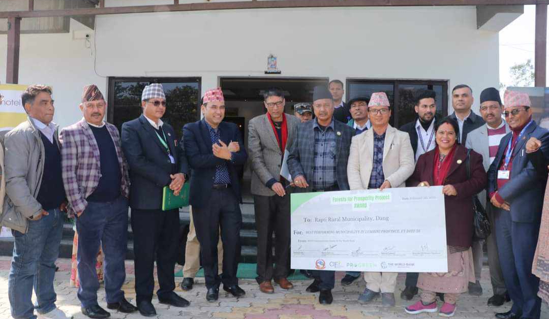 दाङ । समृद्धिका लागि वन परियोजना कार्यक्रम अन्तर्गत उत्कृष्ट कार्यसम्पादन मूल्याङ्कनका आधारमा दाङको राप्ती गाउँपालिका सहित लुम्बिनी प्रदेशका ३ स्थानीय तहहरु सम्मानित भएका छन् । उक्त परियोजना लागू भएका लुम्बिनी प्रदेशका २५ वटा स्थानीय तहहरुमध्ये कार्यसम्पादन मूल्याङ्कनका आधारमा दाङको राप्ती गाउँपालिका सहित बाँकेको बैजनाथ गाँउपालिका र रूपन्देहीकाे सैनामैना नगरपालिका उत्कृष्ट गाउँपालिकाकाे रुपमा छनाेट भई सम्मानित […]