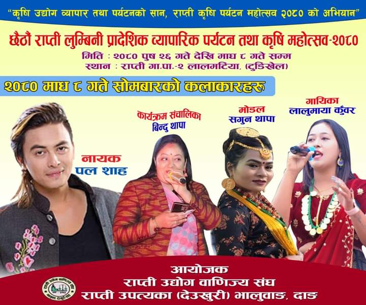 दाङ । देउखुरीको राप्ती गाउँपालिका वडा नम्बर २ लालमटिया स्थित टुडि खेल मैदानमा संचालन रहेको लालमटिया महोत्सवमा सोमबार आज नायक पल शाह आउने भएका छन् । कृषि उद्योग व्यापार तथा पर्यटनको सान,राप्ती कृषि पर्यटन महोत्सव २०८० को अभियान भन्ने मुल नाराका साथ राप्ती उद्योग बाणिज्य संघ भालुबाङको आयोजनामा गत पुस २६ गतेदेखि संचालन रहेको छैठौं […]