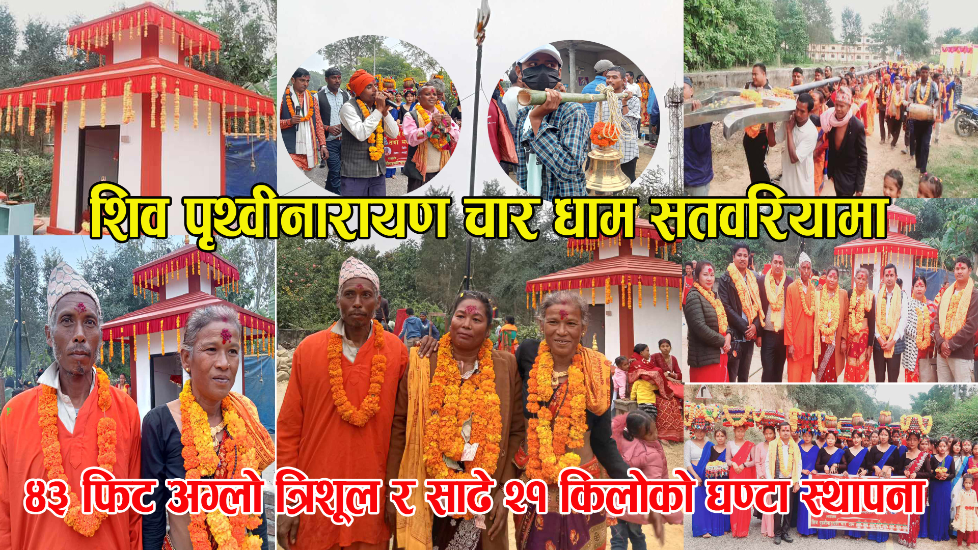 दाङ । शिव पृथ्वीनारायण चार धाम लमही नगरपालिका ८ सतवरिया ( बिच्कागाउँ)मा त्रिशूल र घण्टा स्थापना गरिएको छ । शिवसवरी धाम धार्मिक केन्द्र राप्ती गाउँपालिका-५ पहरूवा पछिको दोस्रो धामको रूपमा स्थापित शिव पृथ्वीनारायण चारधाममा ४३ फिट अग्लो, ५.५ इन्च मोटाई रहेको त्रिशुल र साढे २१ किलोको घण्टा स्थापना गरिएको हो । स्व. गुल्पी चाैधरीको स्मृतिमा […]