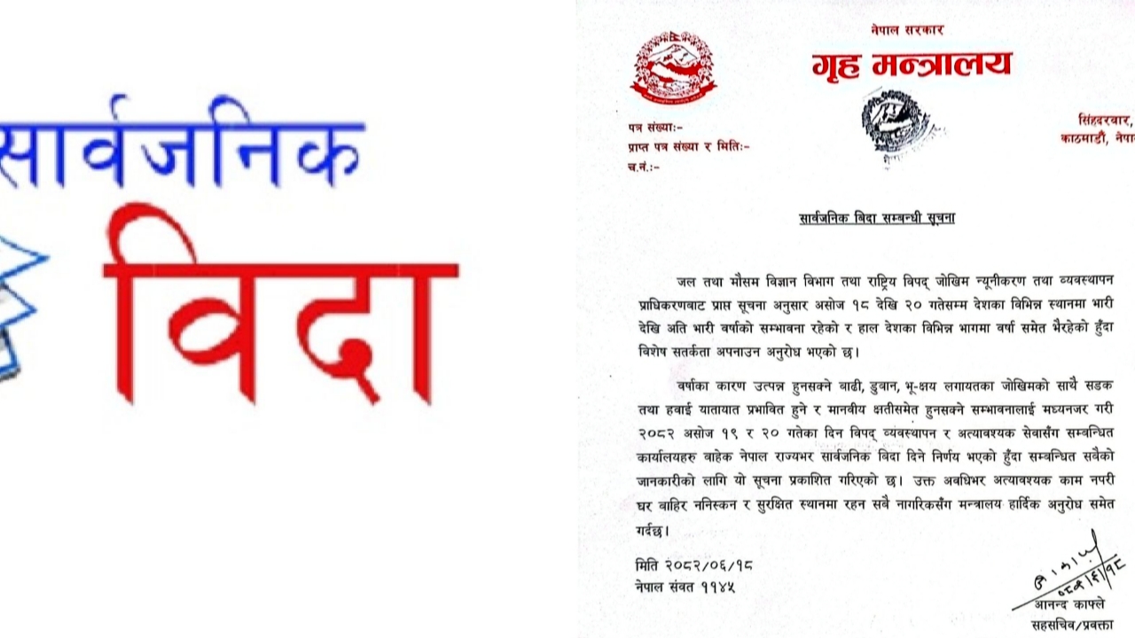 काठमाडौँ । सरकारले देशभर २ दिन सार्वजनिक बिदा दिने निर्णय गरेको छ । गृह मन्त्रालयले शनिबार जारी गरेको सूचनामा देशका विभिन्न भागमा भारीदेखि अति भारी वर्षाको सम्भावना रहेको र जसका कारण आइपर्नसक्ने परिस्थितिलाई मध्यनजर गर्दै असोज १९ र २० गते सार्वजनिक बिदा निर्णय गरिएको उल्लेख छ । त्यस्तै मन्त्रालयका अनुसार पछिल्ला दिनमा लगातार वर्षा भइरहेको […]