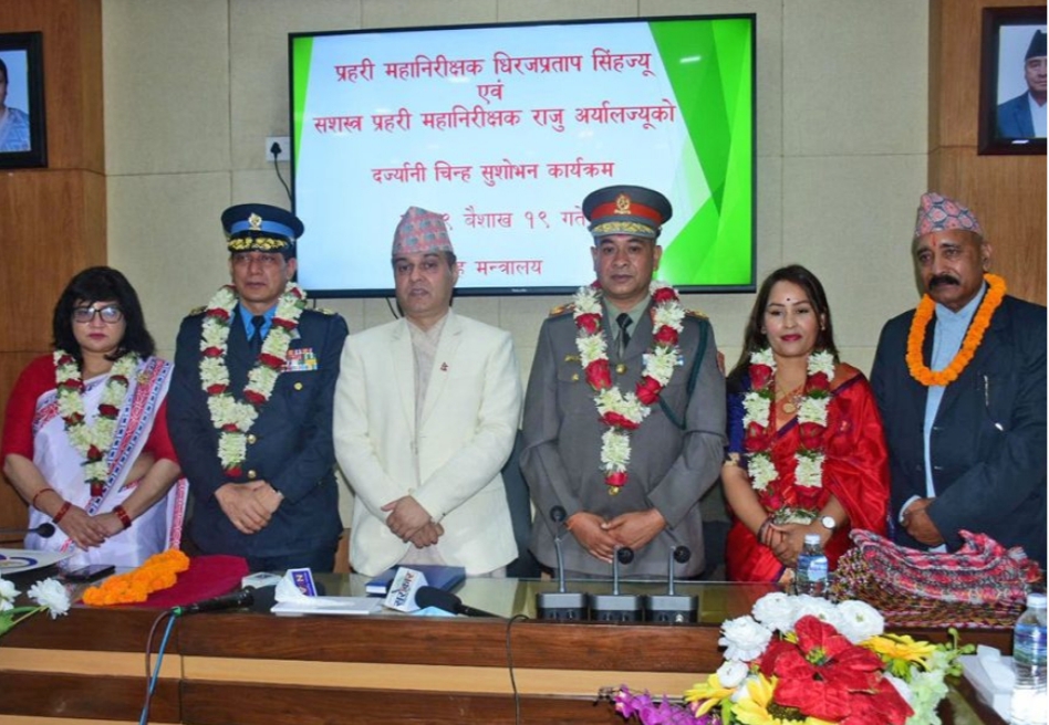 काठमाडौं । सशस्त्र प्रहरी बल र नेपाल प्रहरीका नवनियुक्त महानिरीक्षक (आईजीपी)ले आज दर्ज्यानी चिह्न लगाउनु भएको छ । सशस्त्र प्रहरी बलका महानिरीक्षक राजु अर्याल र नेपाल प्रहरीका महानिरीक्षक धिरजप्रताप सिंहलाई गृह मन्त्रालयका सचिव टेक नारायण पाण्डेले दर्ज्यानी चिह्न लगाइदिनु भएको हो । त्यस्तै अर्याल र सिंहलाई आइतबारको मन्त्रिपरिषद बैठकले महानिरीक्षक पदमा बढुवा गर्ने निर्णय गरेको […]