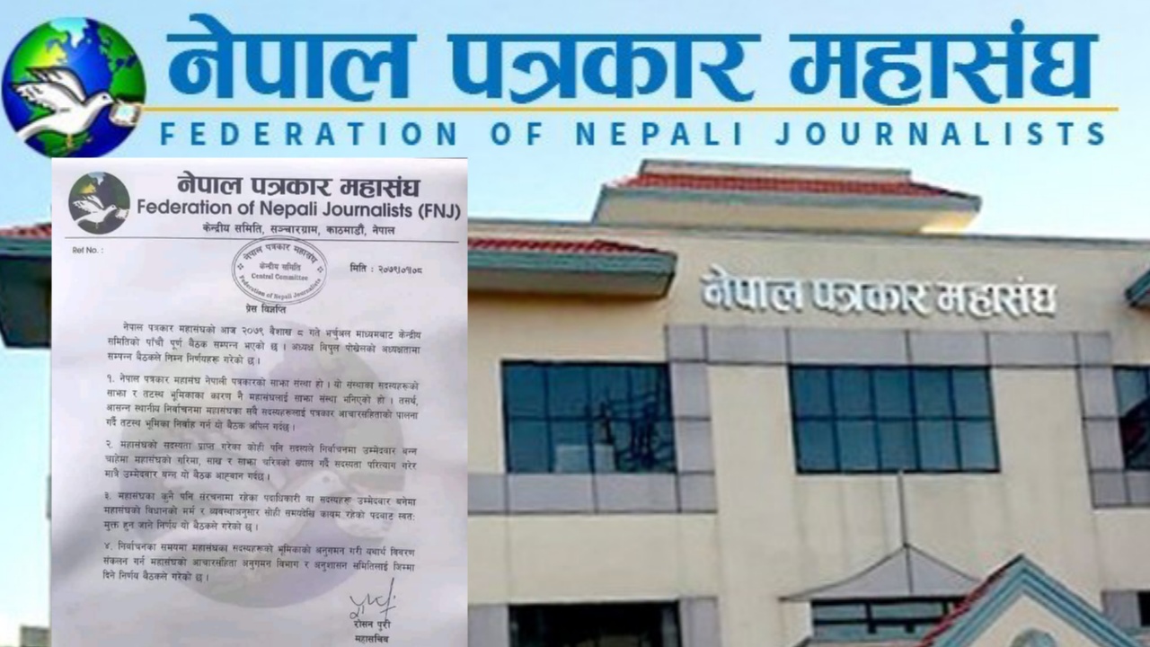काठमाडौं । नेपाल पत्रकार महासंघको आज भर्चुअल माध्यमबाट केन्द्रीय समितिको पाँचौं पूर्ण बैठक सम्पन्न भएको छ। संघका अध्यक्ष विपुल पोख्रेलको अध्यक्षतामा सम्पन्न बैठकले निम्न निर्णयहरु गरेको छ। नेपाल पत्रकार महासंघ नेपाली पत्रकार साझा संस्था हो। यो संस्थाका सदस्यहरूको साझा तटस्थ भूमिका कारण नै महासंघलाई साझा संस्था भनेको हो, तसर्थ आसन्न स्थानीय निर्वाचनमा महासङ्घका सबै सदस्यहरुलाई […]