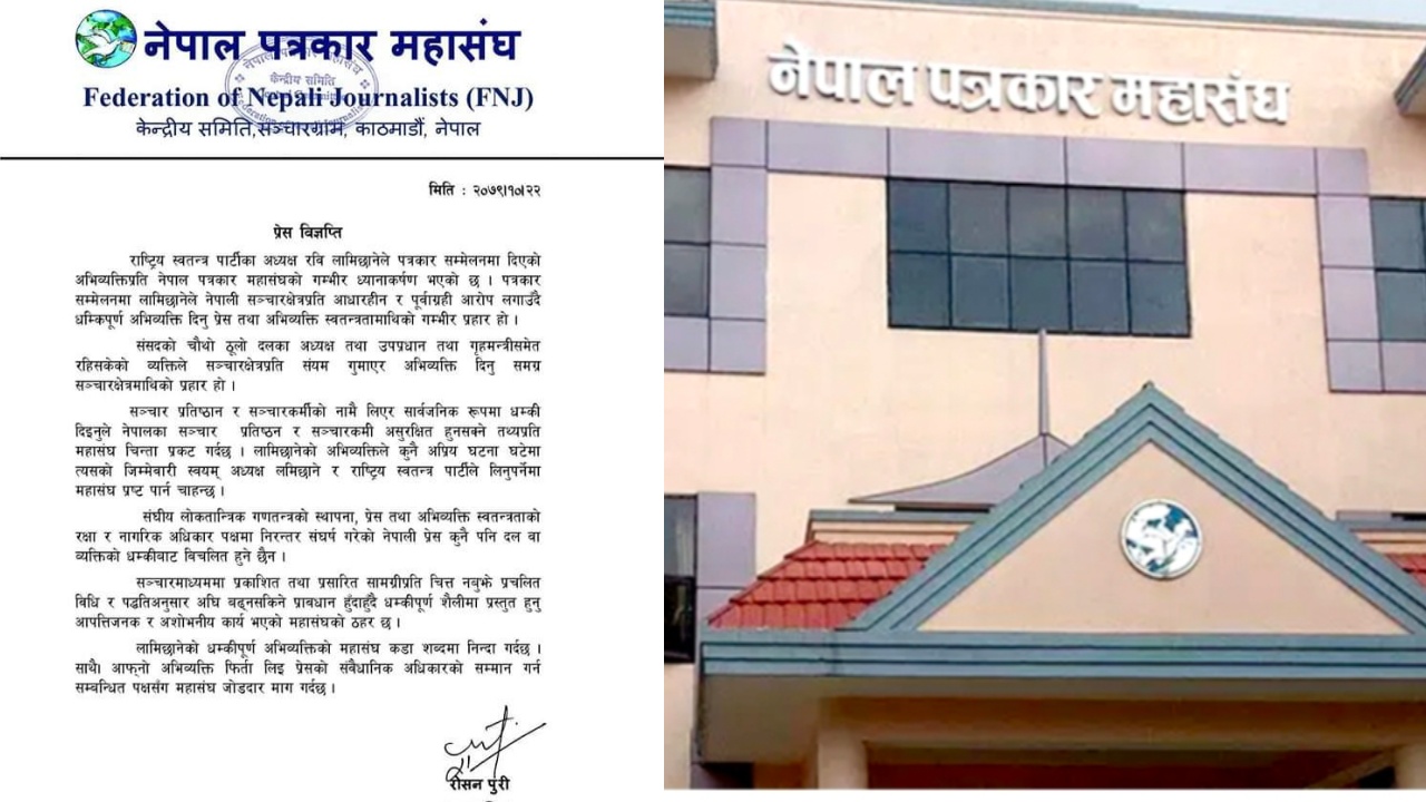 काठमाडौं । नेपाल पत्रकार महासंघले राष्ट्रिय स्वतन्त्र पार्टीका सभापति रवि लामिछानेले सञ्चार क्षेत्रप्रति दिएको अभिव्यक्ति आपत्तिजनक र अशोभनीय भएएको बताएको छ । आइतबार रास्वपाको केन्द्रीय समिति र संसदीय दलको संयुक्त बैठकपछि आयोजित पत्रकार सम्मेलनमा लामिछानेले सञ्चार माध्यम, तिनका सञ्चालक र पत्रकारबारे टिप्पणी गरेका थिए । रविले आधारहीन र पूर्वाग्रही आरोप लगाएर धम्कीपूर्ण अभिव्यक्ति दिएको भन्दै […]