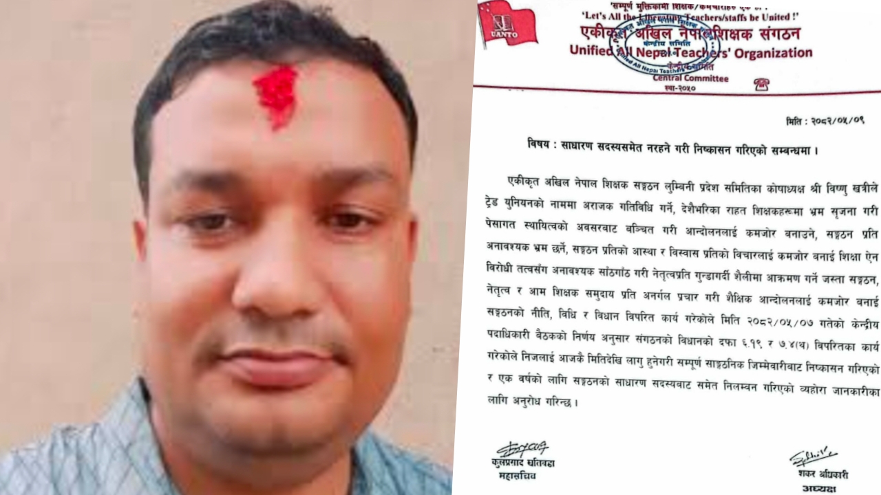 दाङ । एकीकृत अखिल नेपाल शिक्षक संगठनले लुम्बिनी प्रदेश समितिका कोषाध्यक्ष विष्णु खत्रीलाई सम्पूर्ण संगठनात्मक जिम्मेवारीबाट निष्कासन गरेको छ । साथै उनलाई एक वर्षका लागि साधारण सदस्यबाट समेत निलम्बन गरिएको छ । संगठनले जारी गरेको विज्ञप्ति अनुसार खत्रीले ट्रेड युनियनको नाममा अराजक गतिविधि गर्ने, राहत शिक्षकहरूलाई भ्रममा पार्ने, पेसागत स्थायित्वका अवसरबाट वञ्चित गराउने, संगठनप्रति अनावश्यक […]