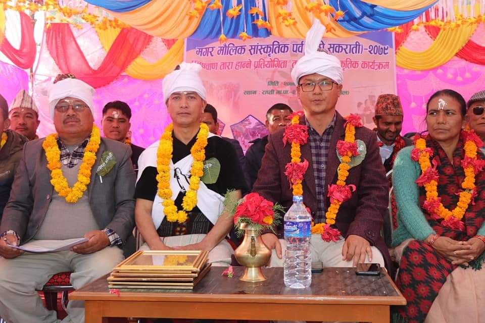 दाङ । देउखुरीको राप्ती गाउँपालिकामा नेपाल मगर संघ राप्ती गाउँ कार्यसमितिको आयोजनामा शनिबार गाउँपालिका स्तरीय माघे संक्रान्ति विशेष माघी मिलन कार्यक्रम सम्पन्न भएको छ ।नेपाल मगर संघ राप्ती गाउँ कार्यसमितिका अध्यक्ष धनिराम घर्ती मगरको अध्यक्षता तथा राप्ती गाउँपालिकाका अध्यक्ष प्रकाश विष्टको प्रमुख आतिथ्यतामा उद्घाटन भएको कार्यक्रममा प्रमुख अतिथि विष्टले मगरहरुको पोशाक वर्षमा एक दिन मात्र […]