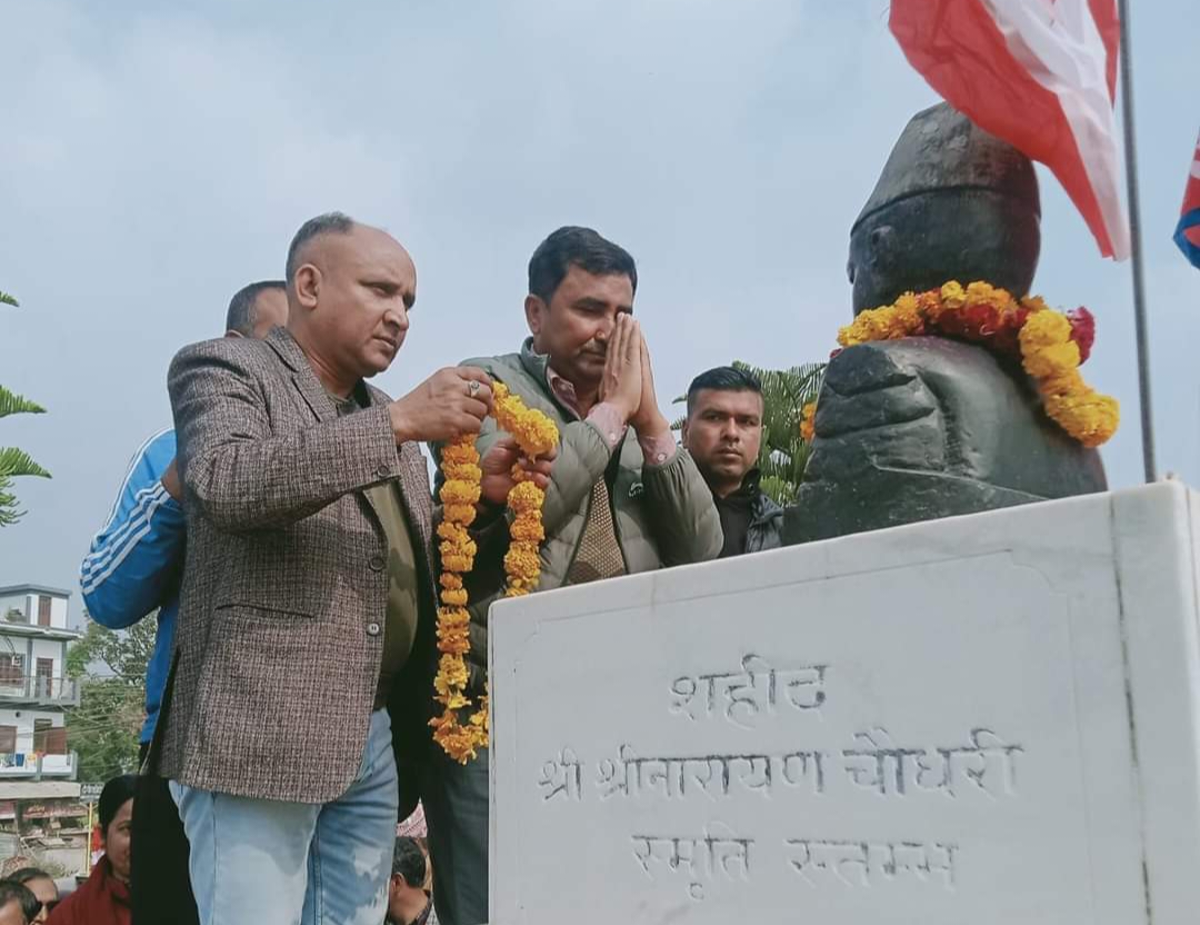 दाङ । नेपाली काङ्ग्रेस राप्ती गाउँपालिकाले सोमबार शहिद श्रीनारायण चौधरीको २२ औं स्मृती दिवस मनाएको छ । राप्ती गाउँपालिका वडा नम्बर ४ मौरीघाटमा रहेको शहिद श्रीनारायण चौधरीको शालिकमा माल्यापर्ण गरि दिवस मनाइएको हो ।पालिका सभापति विद्याशरण चौधरीको अध्यक्षता एवम् पार्टीका जिल्ला सभापति शंकर डाँगीको प्रमुख आथित्यता तथा लुम्बिनी प्रदेश सदस्य देवनारायण चौधरीको विशिष्ट आथित्यतामा भएको […]