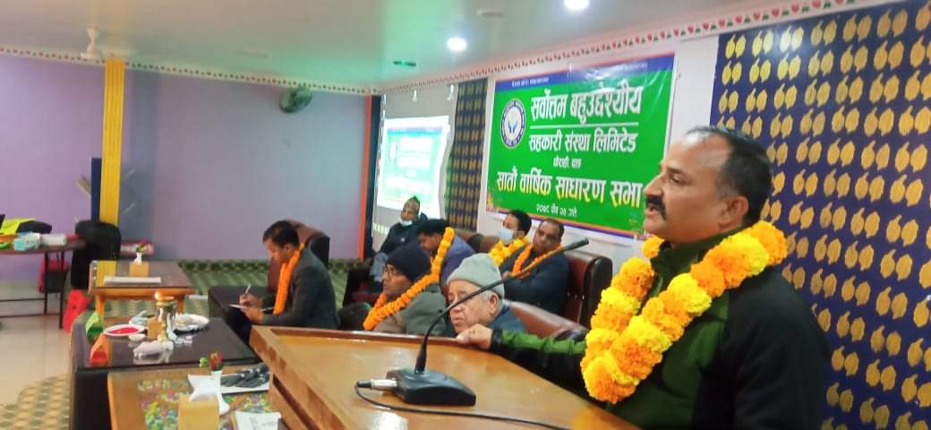 दाङ । दाङको घोराहीमा रहेको सर्बोतम बहुउद्देश्यीय सहकारी संस्था लिमिटेडको सातौं वार्षिक साधारण सभा आज शनिबार घोराहीमा सम्पन्न भएको छ । संस्थाका अध्यक्ष धुरबराज पौडेलको अध्यक्षता एवं घोराही उपमहानगरपालिका वडा नम्बर १५ का वडा अध्यक्ष रमेशकुमार पाण्डेको प्रमुख आतिथ्यतामा साधारण सभा सम्पन्न भएको हो । कार्यक्रममा बोल्दै प्रमुख अतिथि पाण्डेले सहकारीले नागरिकको आर्थिक विकासमा सहयोग […]